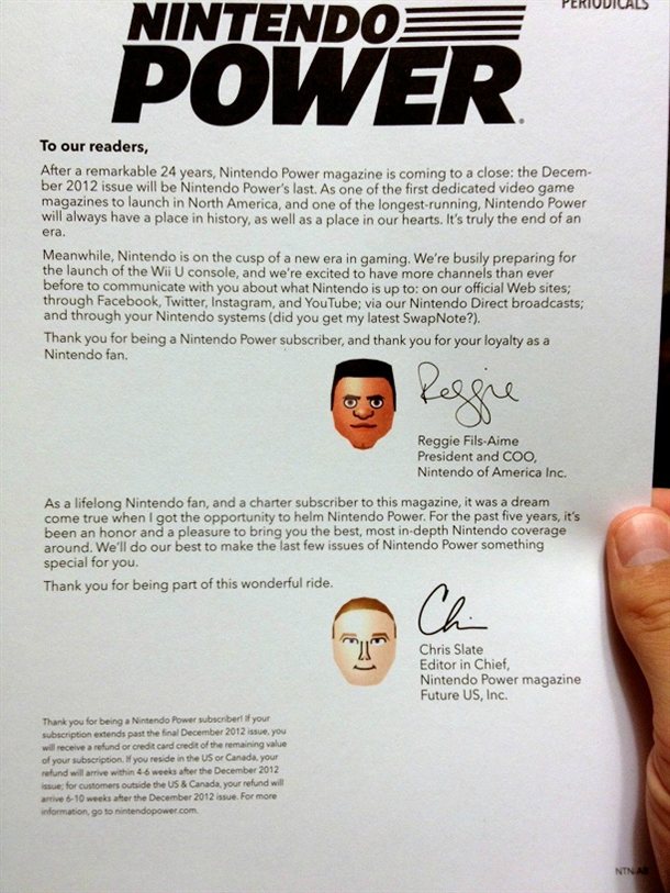 Erst seit kurzem ist bekannt, dass Nintendo das Magazin Nintendo Power still legt und tatsächlich wird die Dezemberausgabe die letzte des 24 Jahre alten Videospiel-Magazins sein. Als eines der ersten Videospiel-Magazine überhaupt ist es beinahe schon traurig, wie es nun damit zu Ende geht. In einem Brief, welcher jeder Abonnent der Zeitschrift erhalten hat, bedankt sich Chris Slate (Chefredakteur) und Reggie Fils-Aime (Nintendo of America Inc. Präsident und COO) für die langjährige Loyalität und Unterstützung der Abonnenten und Fans.