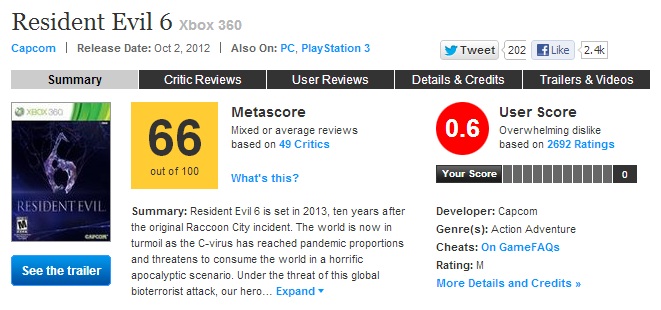 Metacritics werden immer gerne an Land gezogen, wenn man sich vorab ein Bild von einem bestimmten Spiel machen möchte. So auch für das neue Resident Evil 6, das frisch in den Läden bei uns angekommen ist. Abgesehen davon, dass die Wertungen für Resident Evil 6 in der Fachpresse weiter auseinander gehen, als Moses das Meer teilen konnte, sprechen die Userbewertungen eine eindeutige Sprache.