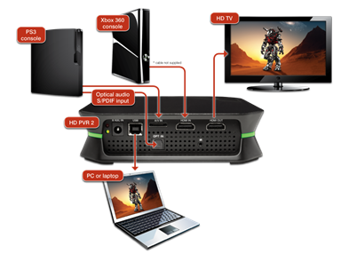 Für den Anschluss einer Xbox® 360 wird die HDMI-Eingangsbuchse auf der Rückseite des Geräts verwendet. Eine PS3® wird hingegen über das mitgelieferte Komponentenkabel am A/V-Eingang angeschlossen, wobei der digitale Ton über den optischen Audio-Eingang (S/PDIF) aufgezeichnet wird. Übrigens: Die Pass-Trough-Funktion leitet das digitale Bild- und Audiosignal verzögerungsfrei zum Beispiel an einen Bildschirm oder HD-Fernseher mit HDMI-Eingang weiter. Damit steht dem uneingeschränkten Spielvergnügen während der Aufzeichnung nichts im Wege.