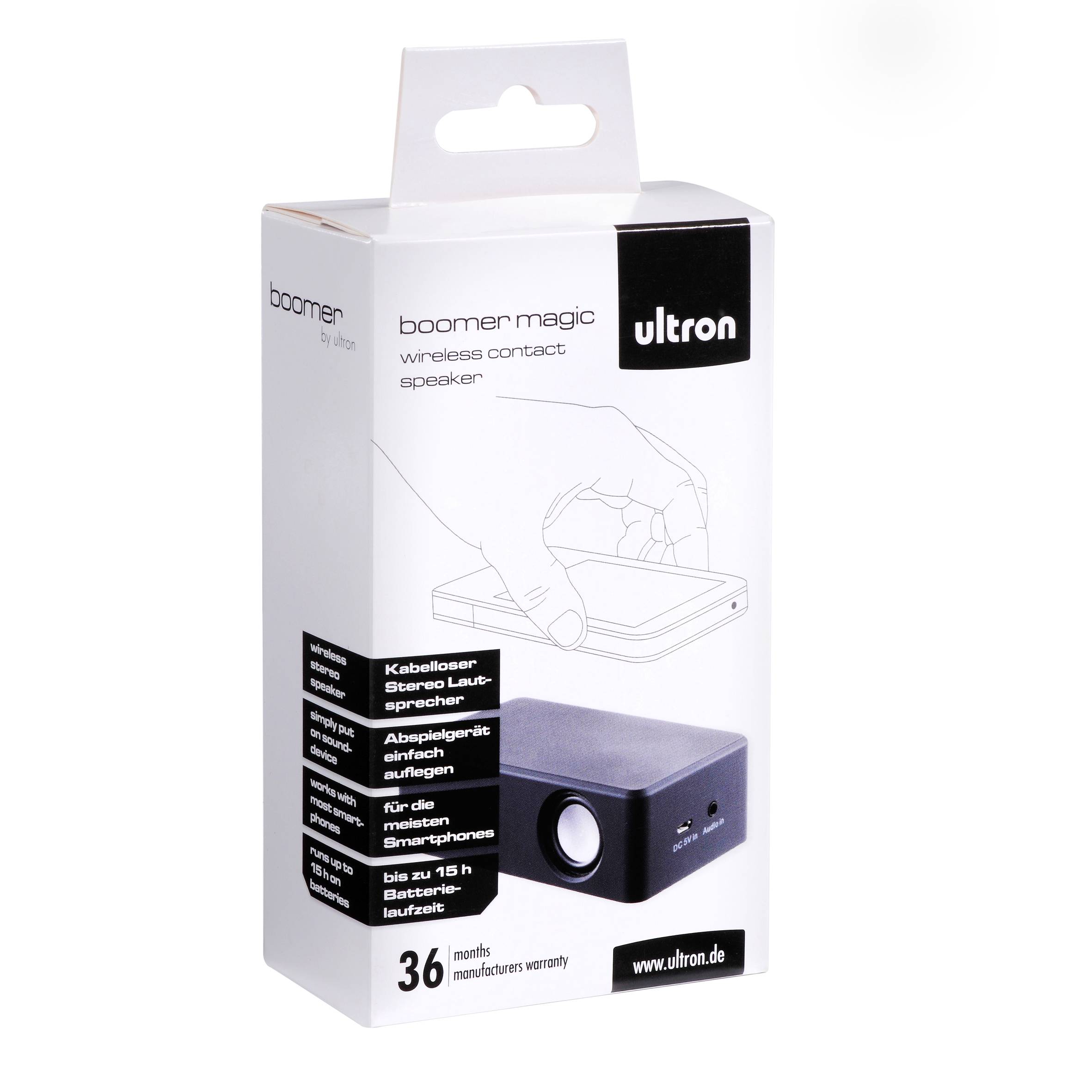 Die neue ultron Aktivbox hat Unterhaltungswert. Nicht nur wegen der Musikwiedergabe mit 2 x 2 Watt – auch wegen der Art, wie sich die Musikquelle mit der Box verbindet. So wird das Smartphone einfach auf die Box gelegt und schon verstärkt sich der Sound und die Musik ertönt über den ultron-Lautsprecher. Dabei ist lediglich zu beachten, dass der Lautsprecher