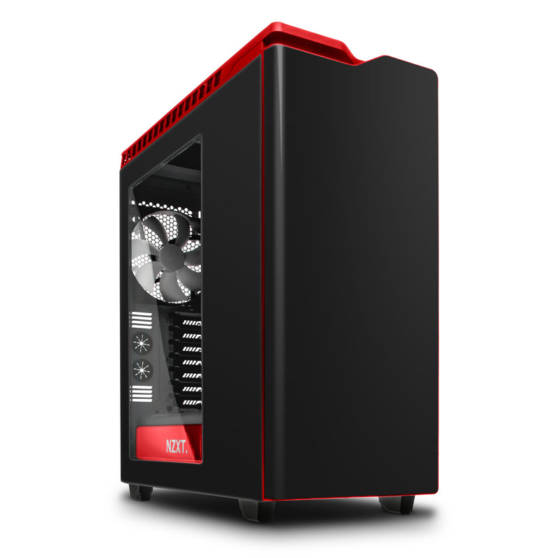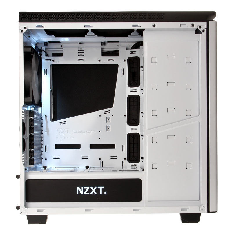 Die dritte Neuerung betrifft das rechteckige Seitenfenster im linken Panel, ein Novum in der Reihe der NZXT-Silent-Gehäuse. Das Großartige daran ist, dass NZXT ein Case geschaffen hat, das im Inneren unglaublich clean gehalten werden kann. So spart das Window einerseits den vorderen Laufwerksbereich komplett aus, wodurch die Daten- und Stromkabel der Speichermedien gar nicht erst in Erscheinung treten. Zum anderen liegt das zu verbauende Netzteil unten hinter einem Shroud verborgen, der fensterseitig mit einer roten Zierplatte samt beleuchtbarem NZXT-Schriftzug glänzt.