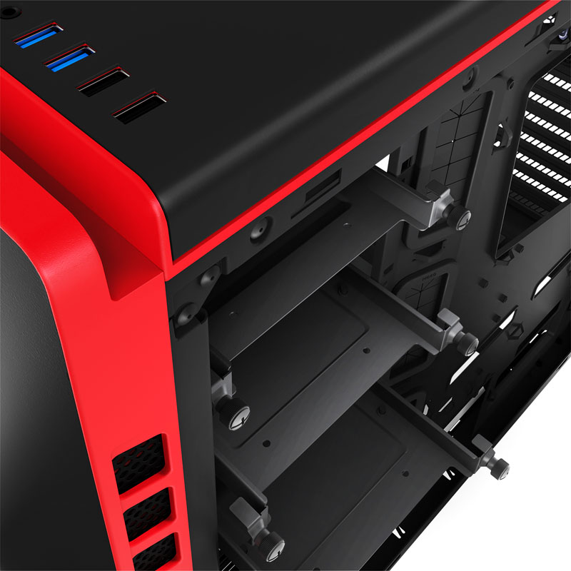 Beleuchten wir die Features des erstklassigen Gehäuses im Detail. Das bei vielen Cases gesehene Mesh vor den drei hier platzierten und ab Werks bereits voll bestückten Lüftereinbauplätzen würde die Idee eines besonders leisen Computergehäuses zerstören. Wie aber schaffen die Designer es dann, die Lüfter “atmen” zu lassen? Ganz einfach, indem sie in die äußeren Ränder der mattschwarzen, metallbeschlagenen Kunststofffront einen nahezu durchgehenden rot-schwarzen Lochgitterstreifen integriert haben. So kann Luft angesogen werden, ohne dass viel Schall nach außen dringt.