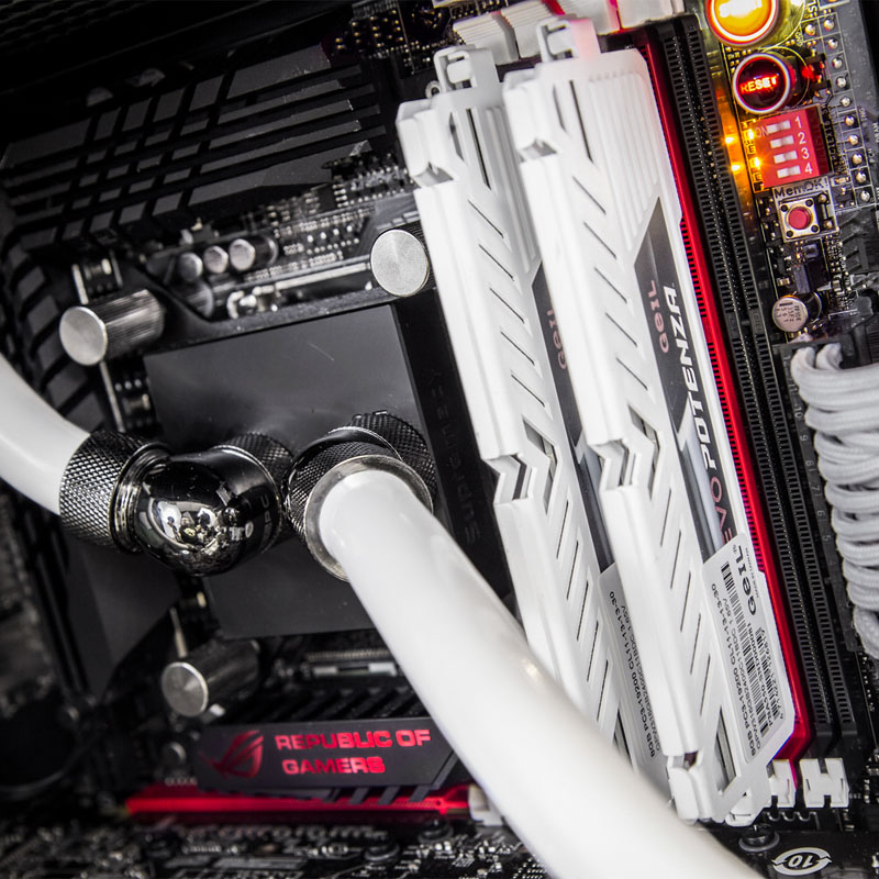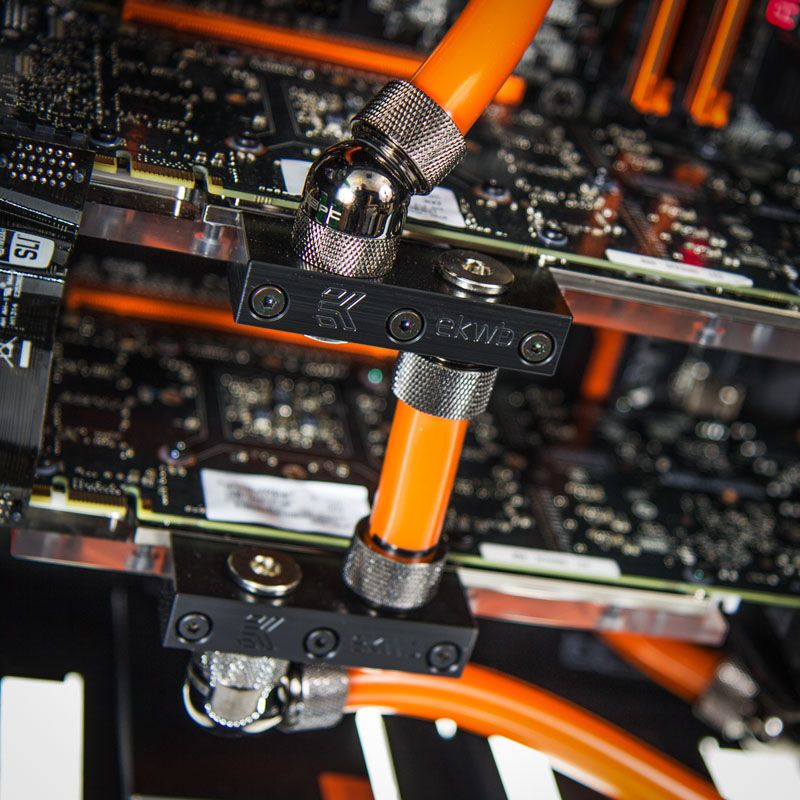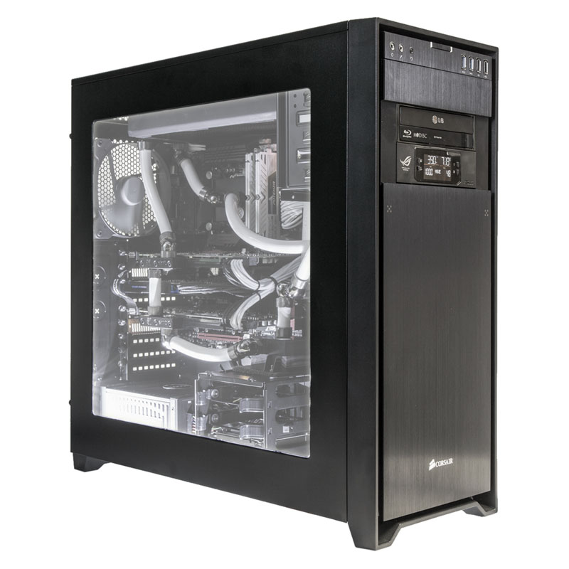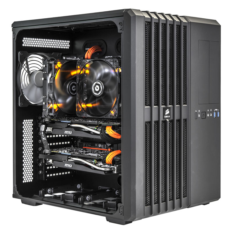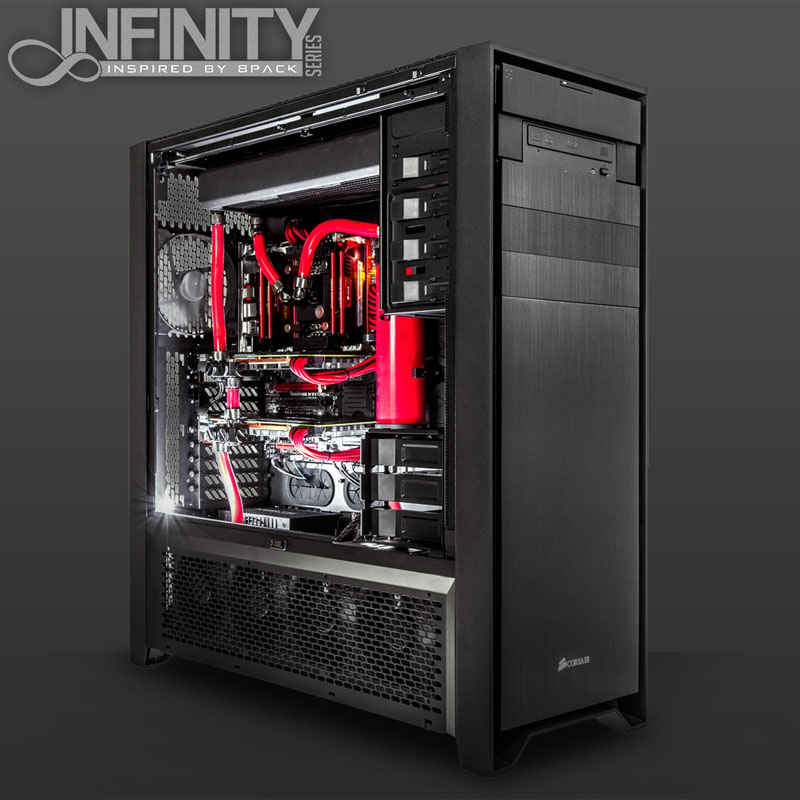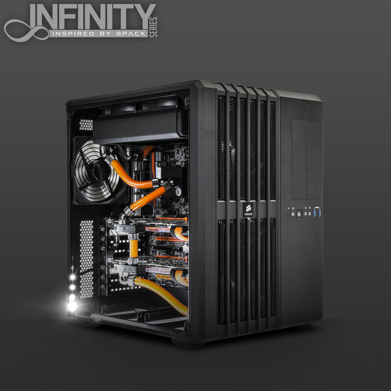 In den Infinity-PCs, die auf stilvolle Gehäuse von Corsair (Carbide 540 Air, Obsidian 750D und 900D) als Gehäuse setzen, arbeiten als Herzstück ein bereits von Haus aus unheimlich schneller Haswell-Prozessor. Ganz in 8Packs Tradition wird dabei ein besonders taktfreudiges Exemplar ausgewählt, das dann auf das maximal mögliche und zugleich absolut stabile Overclocking gehievt wird – Dafür braucht es ein Spitzenmainboard der Z87-Serie (Asus Maximus VI Formula, Rampage IV und Gigabyte Z87-OC) sowie 8 bis 16 GB flotten DDR3-RAM mit 2.133 bis 2.400 MHz Taktfrequenz. Die CPU von Intel arbeitet mit zwei ultrastarken Radeon-R9 290X-Grafikkarten von AMD oder zwei Pixelbeschleunigern vom Typ Titan bzw. 780 Ti von NVIDIA zusammen, die im CrossFireX- bzw. SLI-Verbund jedes Eye-Candy-Game mit hohen Framerates auf den Bildschirm zaubern. Um diese Taktraten zu erreichen und dabei auch noch sehr leise zu arbeiten, sind CPU und VGAs entweder in einen Wasserkühlungskreislauf eingebunden oder mit hochklassigen Luftkühlern versehen.