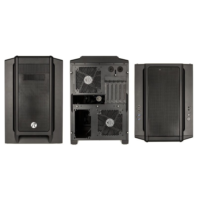 Der 38,0 cm mal 28,8 cm mal 43,0 cm messende Cube ist aus kalt gewalztem Stahl gefertigt und besticht durch sein schlichtes, aber elegantes Äußeres. Die sauber gestaltete Vorderseite beherbergt einen großen Mesh-Abschnitt und ein dezentes RaiJintek-Logo. Dieser Mesh-Bereich erstreckt sich auch über die komplette Oberseite des Cubes und links daneben befindet sich im Deckel das besonders zugänglich platzierte I/O-Panel mit je zwei USB-2.0- und USB-3.0-Ports, während Audio Ein- und Ausgänge sowie LEDs und Power/Reset-Buttons rechts daneben ihren Platz gefunden haben.