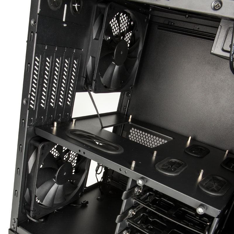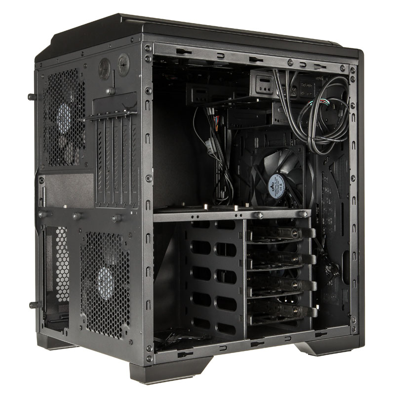 Doch auch Liebhaber von Wasserkühlungen kommen beim Aeneas voll auf ihre Kosten und haben hier die Möglichkeit anstelle der Lüfter im Deckel einen 240-mm-Radiator und in der Front sogar einen 280-mm-Radiator anzubringen. An der Rückseite des Gehäuses befinden sich außerdem zwei Schlauchöffnungen für externe Radiatoren. Im gut zugänglichen und praktischerweise in zwei Kammern aufgeteilten Innenraum des Aeneas (vollständig schwarz lackiert) dürfen Hauptplatinen im Micro-ATX-Format horizontal auf einem – zur bequemen Montage des CPU-Kühlers ausziehbaren – Mainboard-Tray verbaut werden.