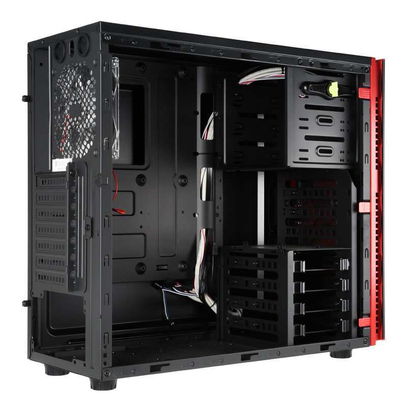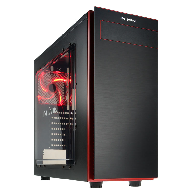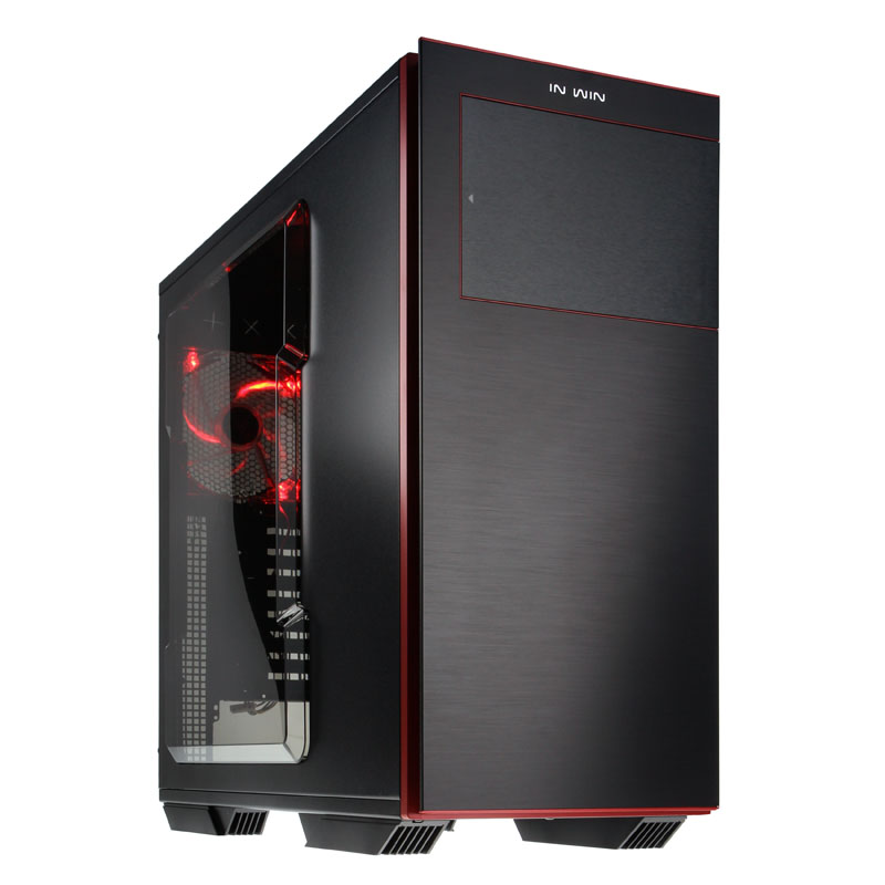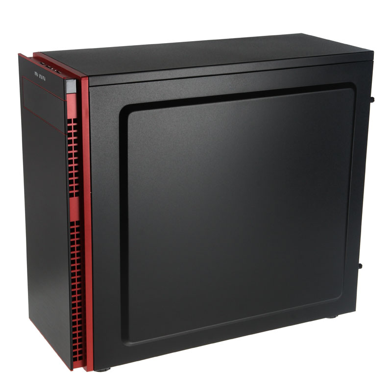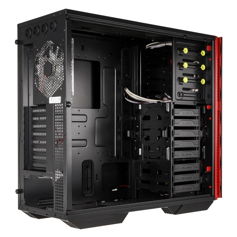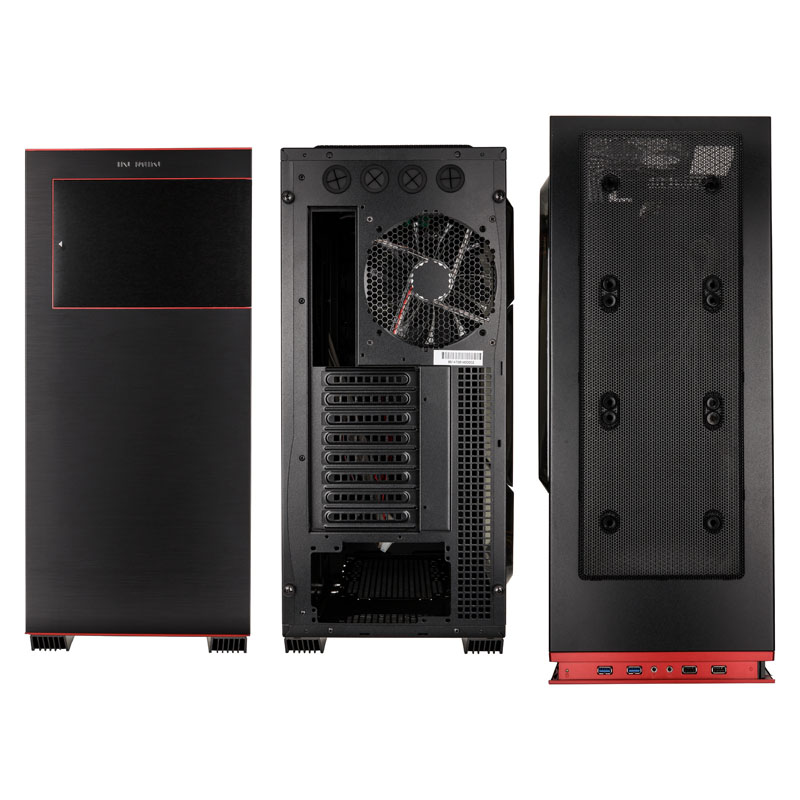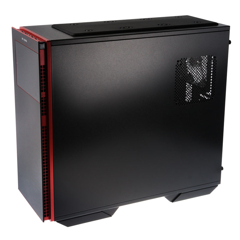Beide Cases sind grundsolide Stahl-Tower aus SECC, der rechts mit einem 140/120-mm-Lüfter-Slot in Höhe des CPU-Sockels (nur 707) und links mit einem großen Acryl-Seitenfenster auftritt, wobei das Window-Sidepanel extra nach außen gewölbt ist und somit der Hardware im Inneren sogar noch mehr Raum gewährt. So stehen für Prozessorkühler in Tower-Bauform zwischen Mainboardtray und Window viel Platz zur Verfügung. Die ganz besondere optische Finesse erhält das In Win 70X aber durch die Frontpartie, die zweiteilig aufgebaut ist. Zuerst schließt der schwarze Stahl-Body mit einem roten Kunststoff-Panel ab, das etwas nach innen rückt und in dessen Seiten die Luftdurchlässe für die Frontlüfter integriert sind.