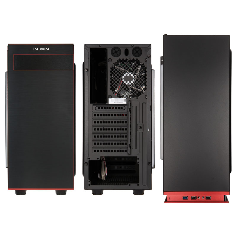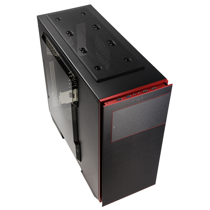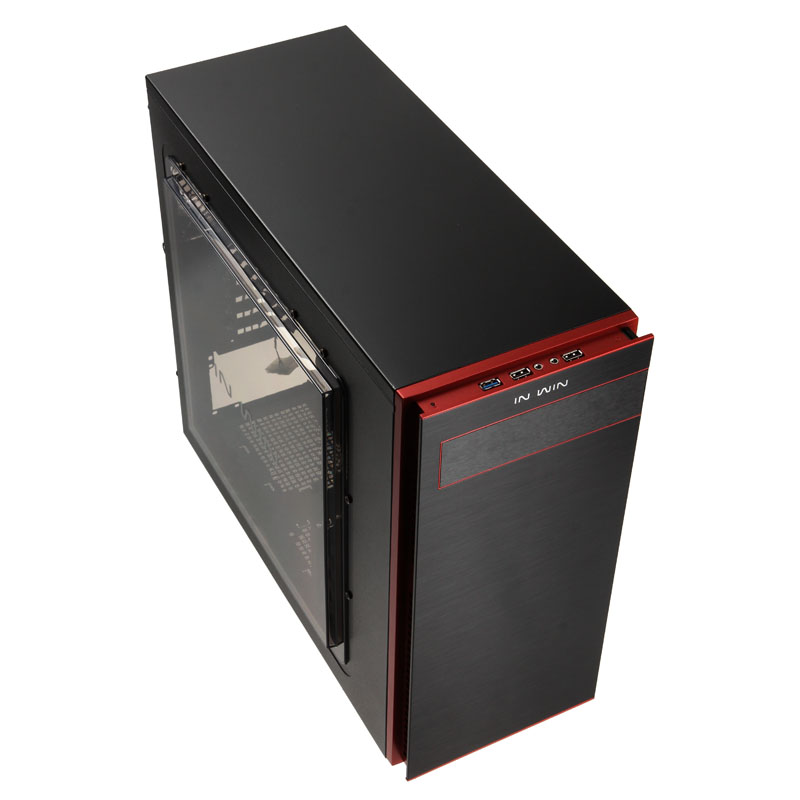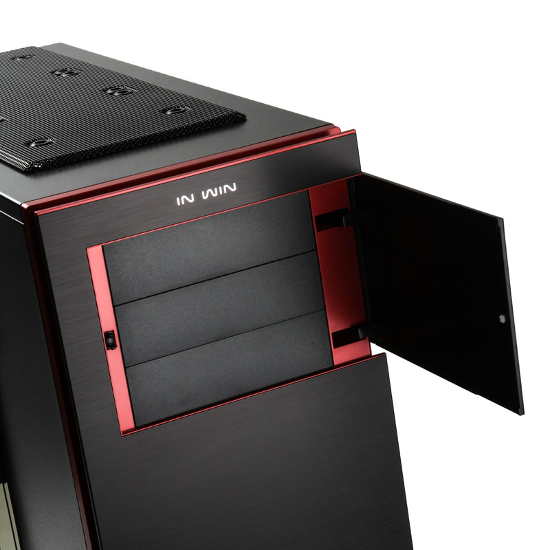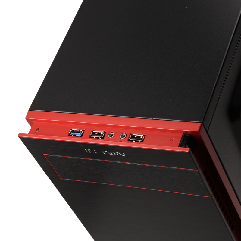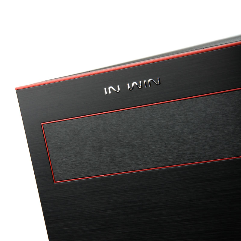 Dann erst folgt das Highlight in Form einer Abschlussplatte aus schwarzem Aluminium, die wieder die volle Breite aufweist und darum leicht vom Body losgelöst scheint. Das Aluminium ist für eine ganz besonders edle Anmutung fein gebürstet worden und nicht erst wegen der roten, umlaufenden Linien ein echtes Fest für die Augen. Hinter einen Klappe sind die externen ODD-Slots (703: einer) verborgen. Oben wird die Frontpartie dann vom silbernen “IN WIN”-Schriftzug gekrönt. Der Blick von oben verrät, wie die Anschlussmöglichkeiten des stilvollen Midi-Gehäuses aussehen. Hier sind nämlich je zwei USB-2.0- sowie schnelle USB-3.0-Ports zur Verbindung mit einer externen Festplatte, einem USB-Stick oder einem Smartphone vorhanden, dazu die Audio-Ports untergebracht.