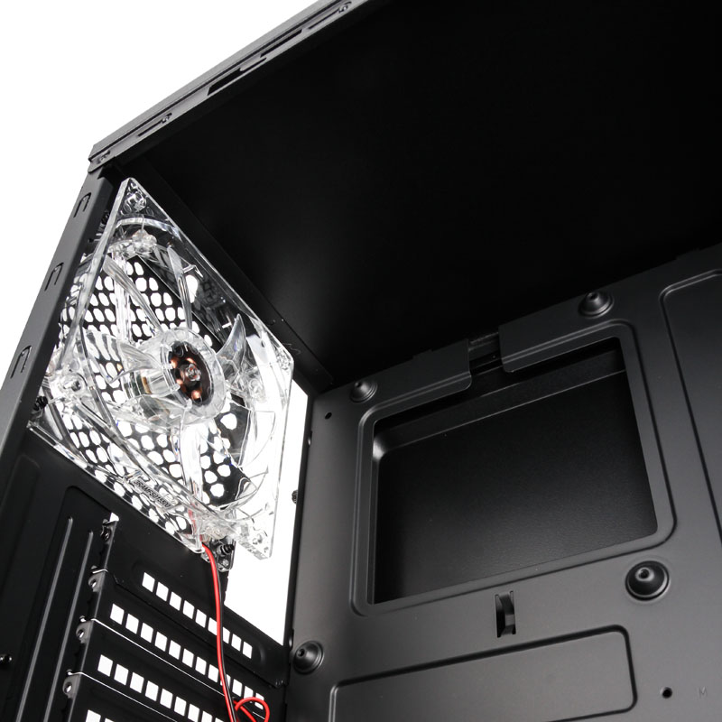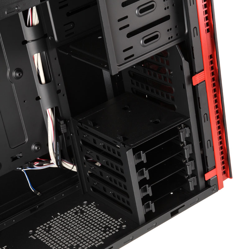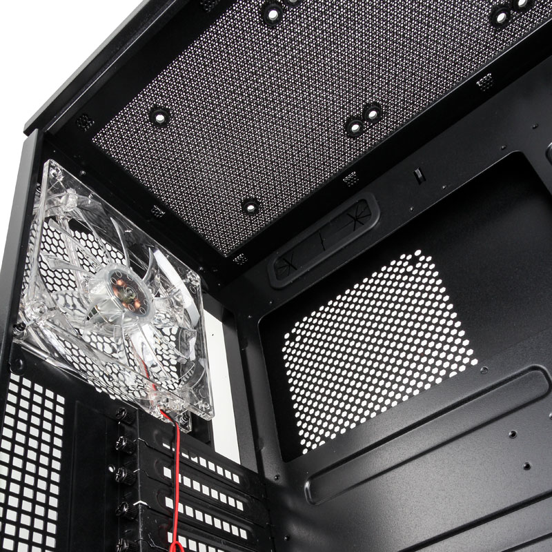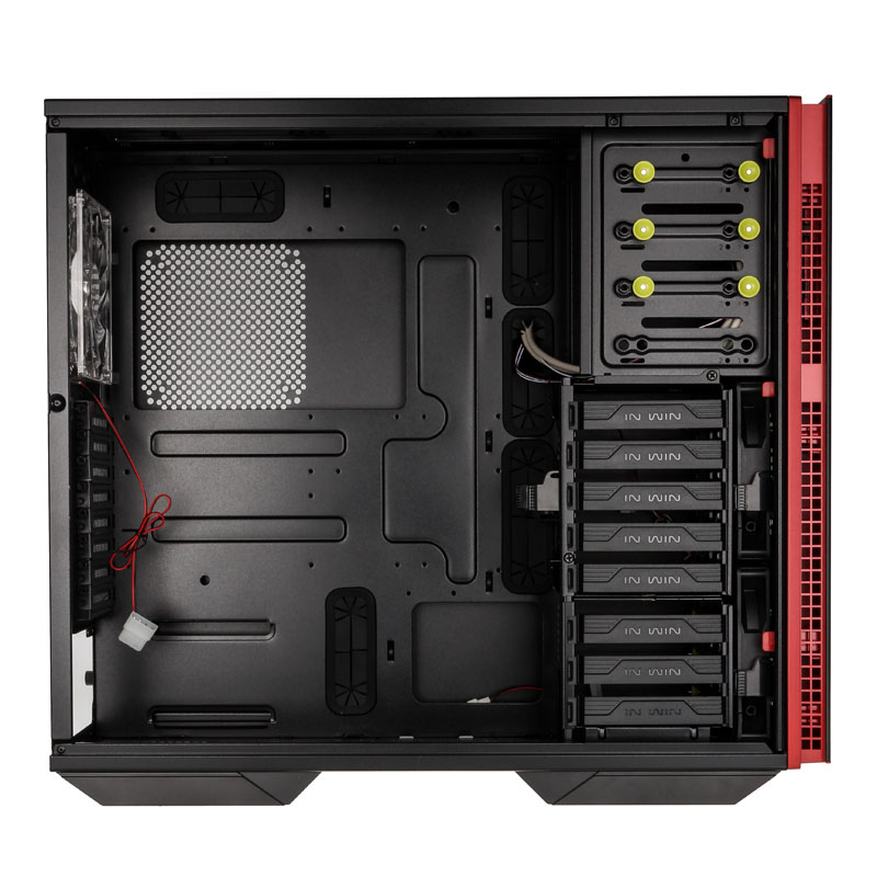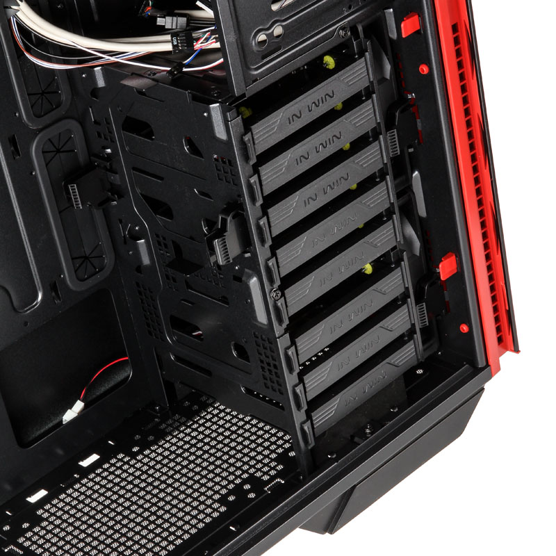 Der Deckel ist beim In Win 703 geschlossen, beim 707 mit einem großen Bereich aus Mesh ausgestattet, welches entweder gleich drei 120-mm-Fans oder aber Radiatoren bis zum 360-mm-Format akzeptiert. Ein weiterer Radiator mit bis zu 240 mm passt in den Boden des größeren Gehäuses, wenn man dafür den unteren HDD-Käfig für drei Laufwerke entfernt. Aber auch bei der Hardwarekühlung mittels Luft macht der Full-Tower eine sehr gute Figur, denn vorne sind bereits zwei 140er vorangebracht, die hinten ein ausblasendes Gegenstück mit roter Beleuchtung finden. Auch im 703 befindet sich rückwärtig ein rot beleuchteter 120er-Lüfter, dem ein Exemplar in der Front zuarbeitet. 3,5-Zoll-Drives und ODDs lassen sich in beiden Towern werkzeuglos einsetzen.