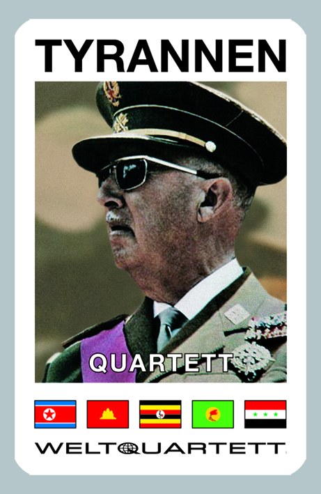 Das „Tyrannen-Quartett“  versammelt die übelsten Diktatoren der Welt auf 32 Spielkarten. Das Spiel funktioniert wie das altbekannte Auto-Quartett, aber statt um Hubraum oder PS geht es hier um Herrschaftsdauer, Opferzahlen und Privatvermögen. Ein unterhaltsamer und lehrreicher Spielspaß für alle, die den nötigen schwarzen Humor mitbringen.