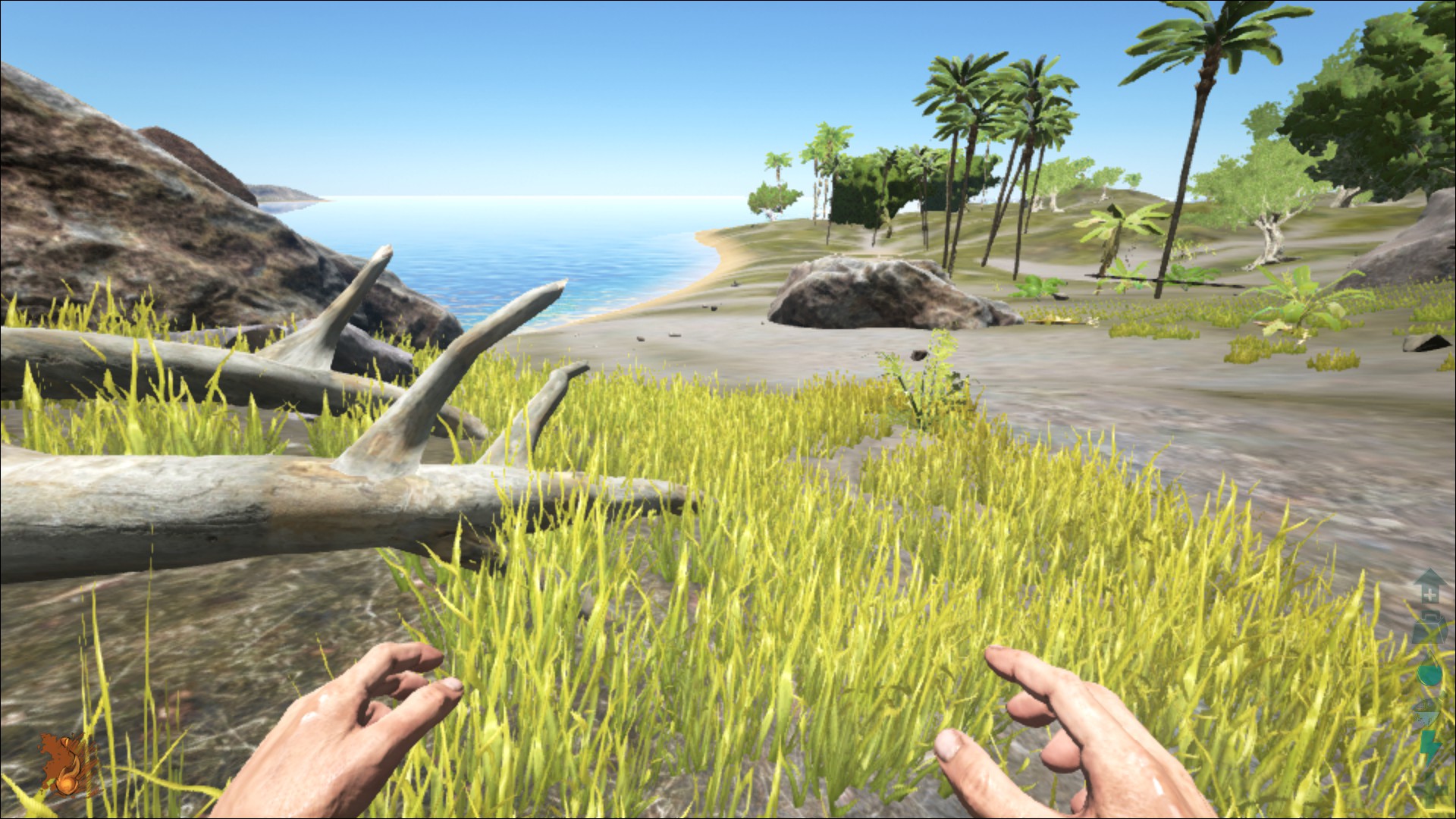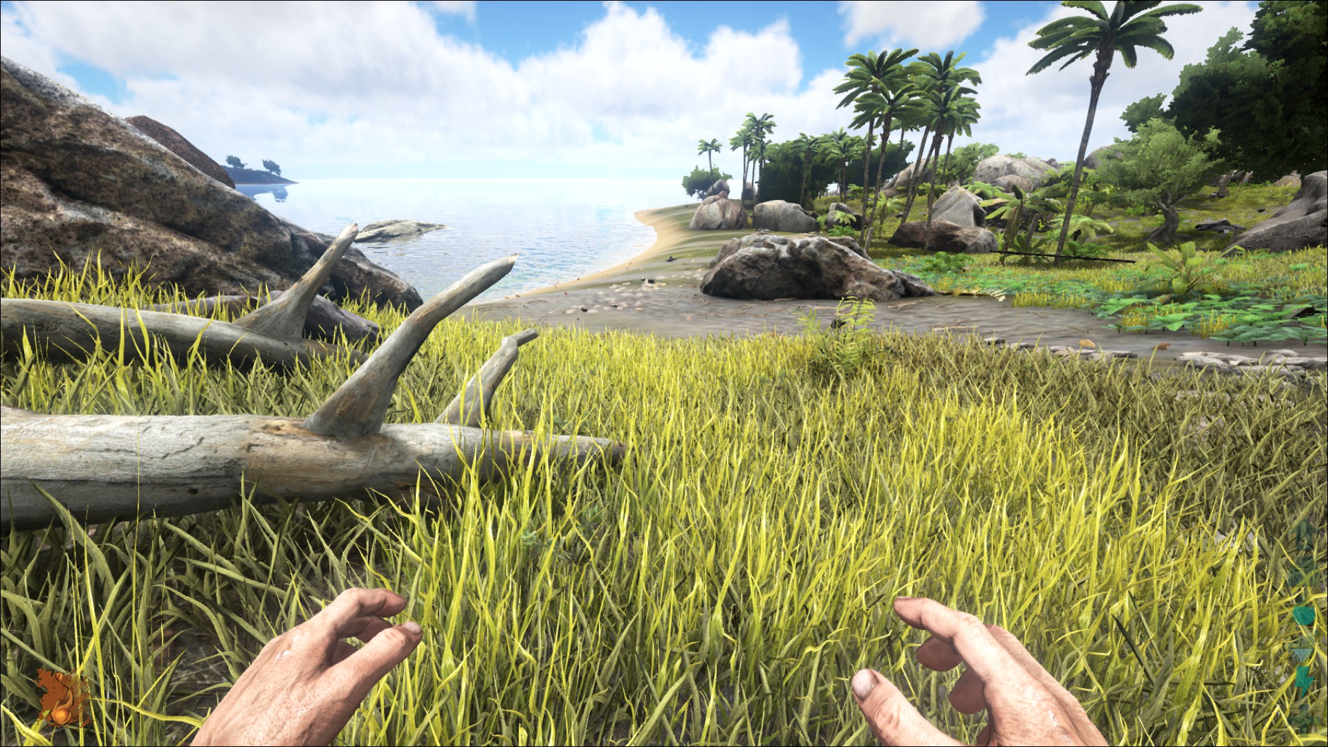 Nochmal kurz den groben Rahmen in Erinnerung bringen: wir erwachen auf der Insel Ark mit einem Implantat im Arm und haben nichts bis auf einen Lendenschurz an. Nun beginnt das Überlebensabenteuer auf der Insel, auf der Dinosaurier frei herumlaufen, uns angreifen, aber auch von uns gezähmt werden können. Das Ganze spielt dabei online auf einem Server mit (je nach Server) bis zu 100 Spielern. Wie in den meisten Online-Survival-Spielen sind auch hier die menschlichen Spieler ein Risikofaktor, denn viele greifen direkt an und wollen unser Inventar plündern.