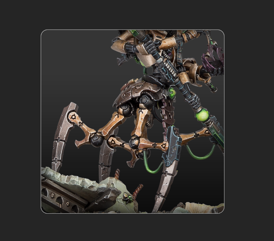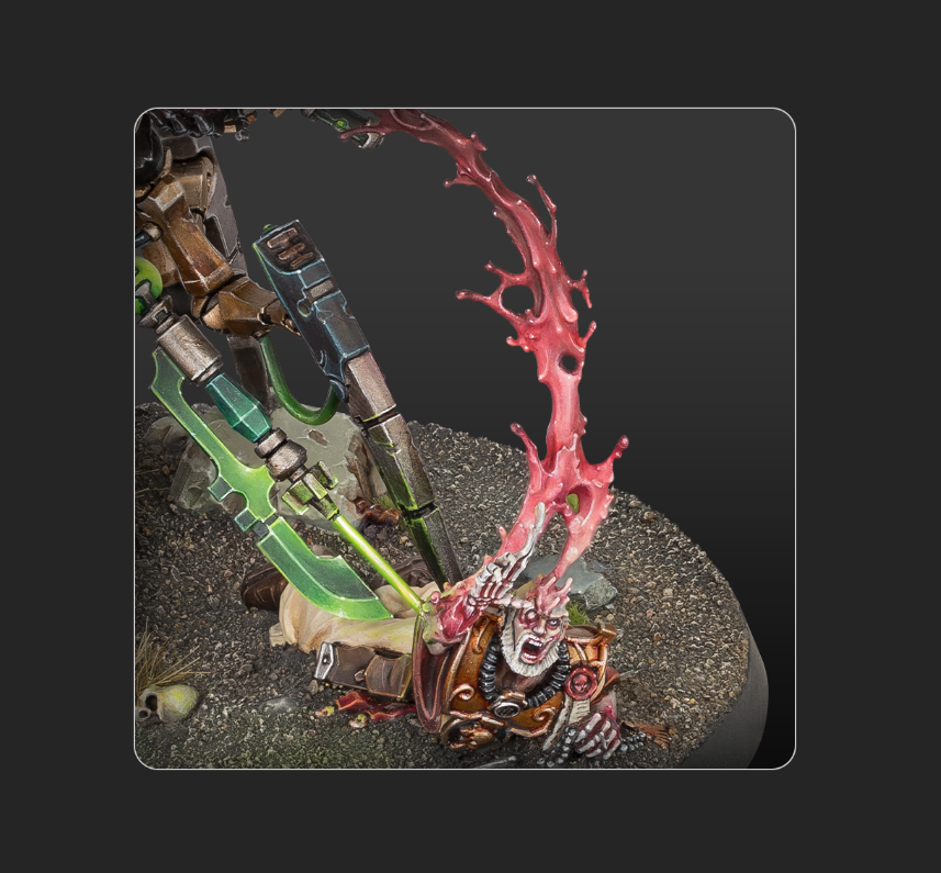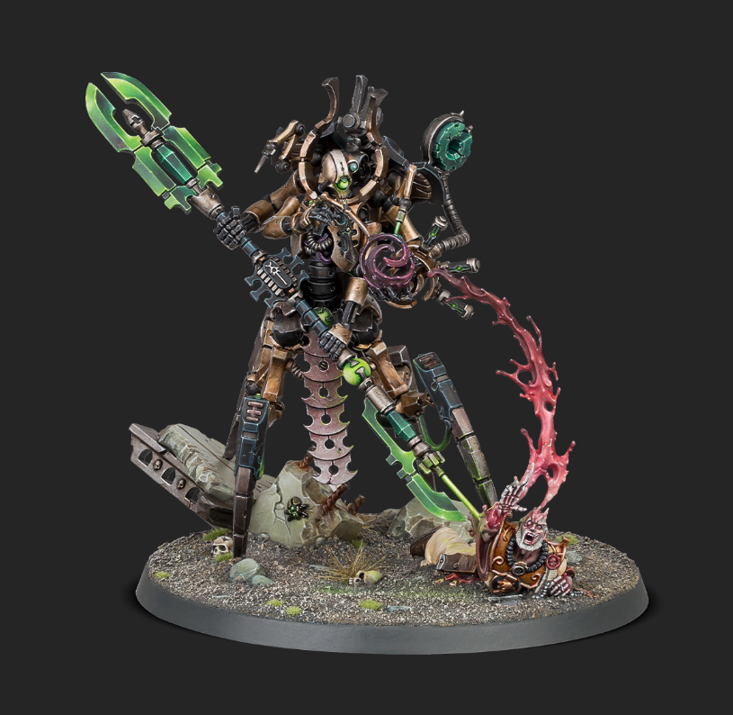 Was für ein Modell! Über die Jahre hinweg hat Games Workshop hier wirklich gute Arbeit geleistet, dass muss man ihnen, an aller negativer Kritik in anderen Bereichen, echt lassen! Die Basegröße allein, aber auch in Kombination mit dem Opfer zu seinen, nun ja, nennen wir sie “Beinen”, lässt auf eine Gesamtgröße im Vergleich zu Guilliman spekulieren. Ein riesiges Model! Aber auch die Menge an Details macht dieses Modell sehr schön. Egal ob es um Extraanbauten an seinen Arbeitshänden geht, zusätzlichen Werkzeugarmen, einer Extrapanzerung, der doppelseitigen Waffen oder wie die Haut seines Opfers verflüssigt und eingesaugt wird. Eine Figur, die Necronspielern wieder Hoffnung geben kann!