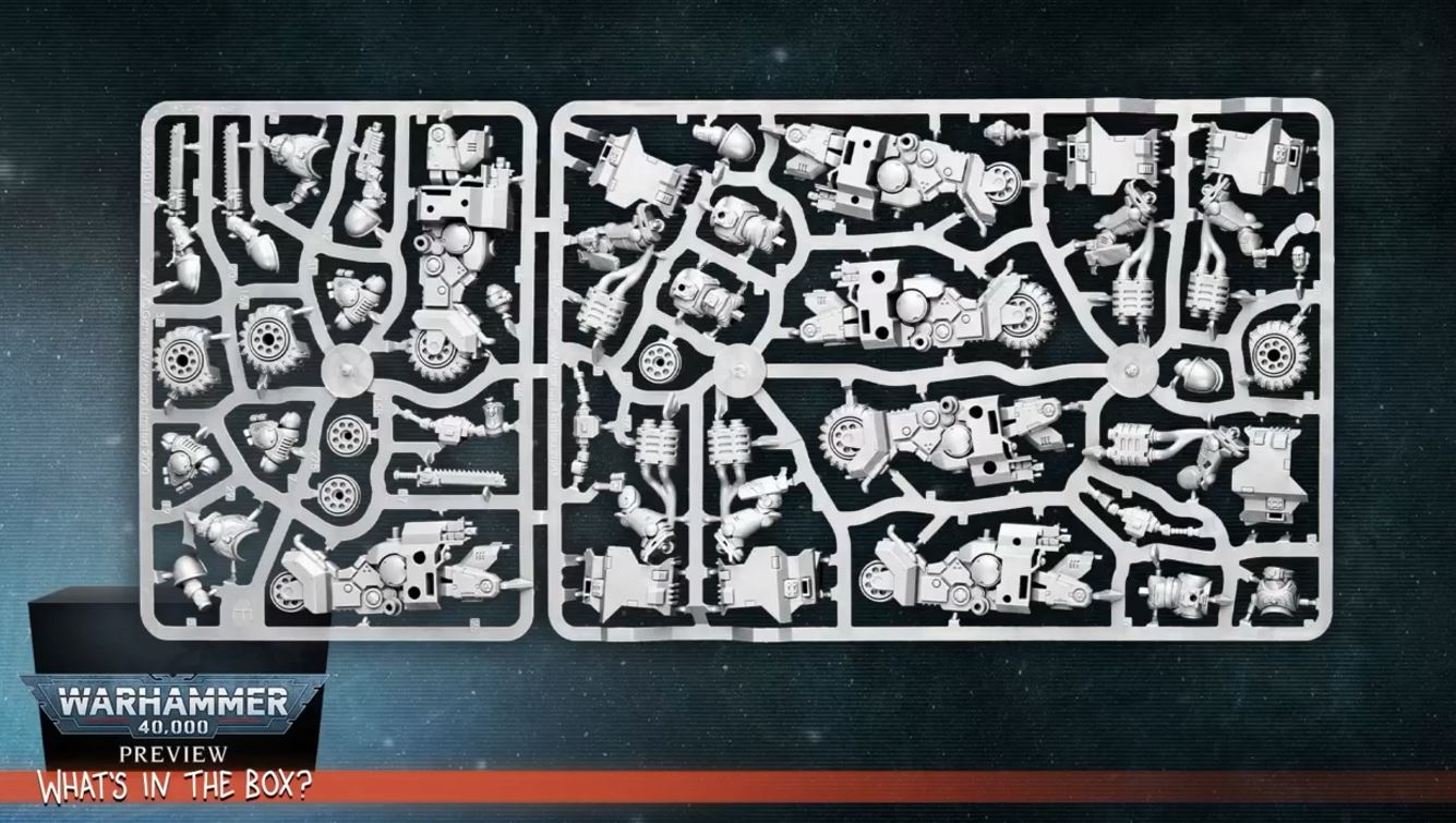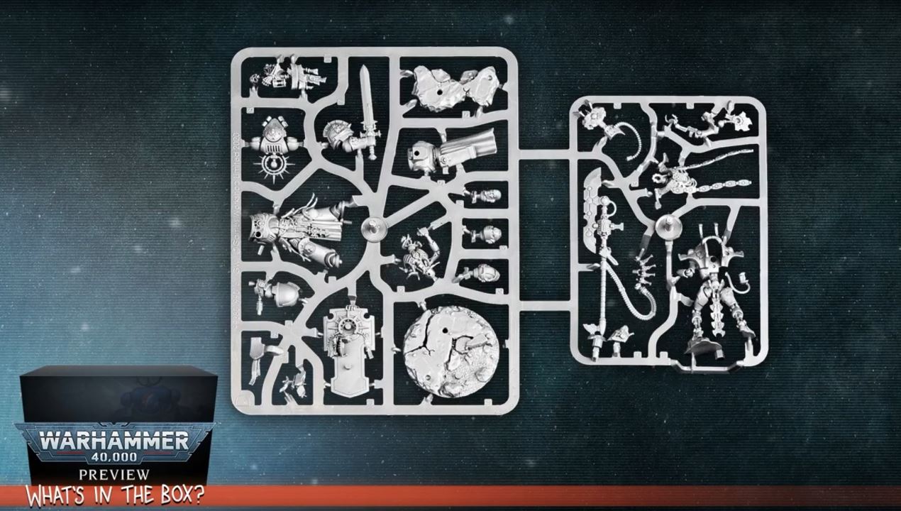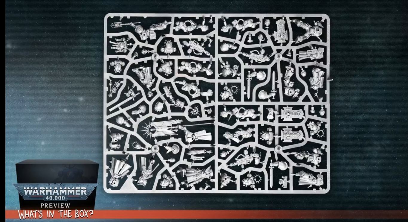 Sprues sind natürlich einige in der Box! Da haben wir Space Marine Captain und Lieutenant, Intercessors und einen Chaplain. Auch die neuen Biker und die neue Nahkampfeinheit “Bladeguard Veterans” mit dem Judicar wurde gezeigt. Ein Bladeguard Ancient bildet mit den Assault Intercessors das Ende der Nahkampfunterstützung in dieser Box und Eredicators Runden das Bild dann ab.
