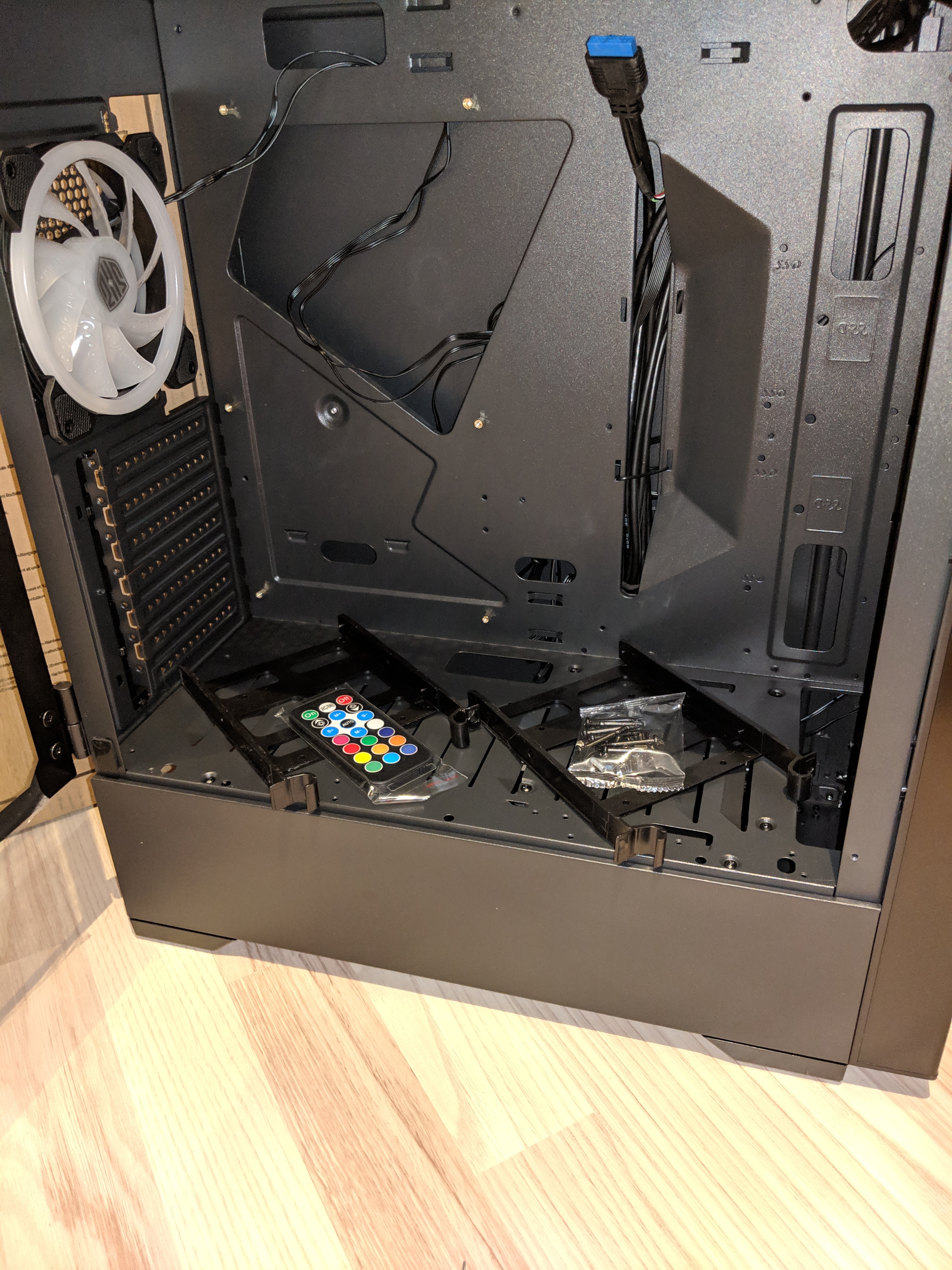 Zum Lieferumfang gehört auch ein Satz Schrauben, Kabelbinder sowie eine Fernbedienung für die RGB-Beleuchtung. Eine Kurzbeschreibung des Gehäuses ist nicht dabei.