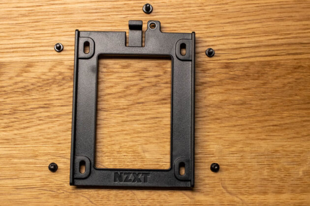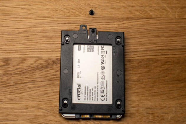 Zur Montage der 2,5″-Laufwerke am Mainboard-Tray muss man lediglich die vormontierte Montagerahmen ausbauen und mit montiertem Laufwerk wieder einbauen. Zwei weitere dieser Montagerahmen liegen bei, damit man zwei weitere 2,5″-Laufwerke auf dem PSU-Cover montieren kann.