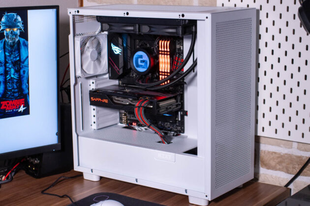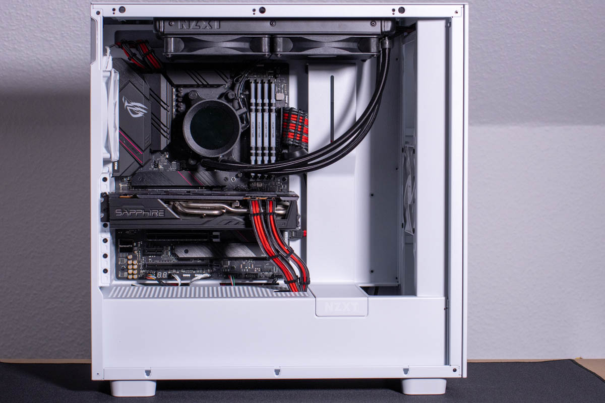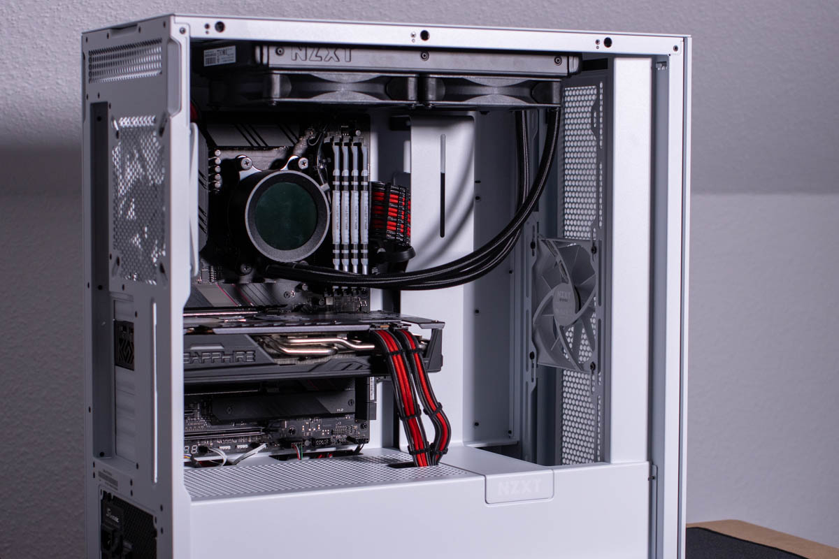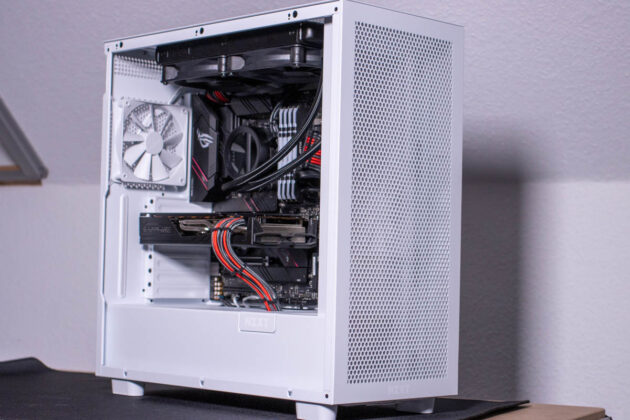 Die großzügigen Öffnungen in der Front des NZXT H7 Flow machen sich im Betrieb direkt bemerklich, denn CPU und GPU laufen direkt etwas kühler als in einem Gehäuse mit geschlossener Front. Hier bietet sich viel Potenzial für ein leises, kühles System, besonders dann, wenn man die Ausbaumöglichkeiten nutzt.