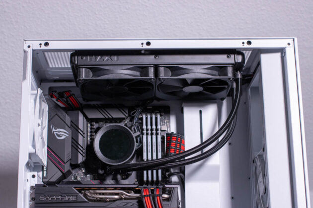 Im Rahmen unseres Tests haben wir uns für den Einbau einer AiO mit 280-mm-Radiator entschieden. Hier haben wir auf eine NZXT Kraken Z63 280 mm zurückgegriffen. Diese haben wir in einer Push-Konfiguration in der Gehäuseoberseite montiert. Der Montageraum an der Oberseite ist hierfür mehr als ausreichend und die AiO ließ sich problemlos montieren. Hierbei sollte man die AiO nach vorne orientiert einbauen, denn im hinteren Bereich kollidiert man ansonsten mit den EPS-Kabeln des Mainboards. Kleinere Kabel lassen sich aber immer noch durch die Öffnung führen. In der Front haben wir in einem zweiten Schritt drei 140 mm große Lüfter verbaut. Hier profitiert man natürlich von dem sehr großzügigen Platzangebot. Hier findet tatsächlich auch ein dicker Radiator Platz oder man kann eine Push-/Pull-Konfiguration realisieren.