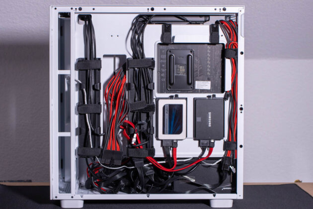 Die Kabelführung zum Mainboard war insgesamt sehr angenehm. Hier kommt einem die große, durchgängige Öffnung an der Oberseite und die von einem Bügel verdeckte Öffnung an der rechten Seite zu gute. Für eine einfachere Montage lässt sich dieser Bügel demontieren. Auch die Durchführungen in der Oberseite des PSU-Covers sind großzügig ausgeführt, da wirklich viele Durchführungsöffnungen vorhanden sind. Verbaut man einen 280 mm großen Radiator in der Gehäuseoberseite, sollte man diesen etwas weiter vorne positionieren, damit die EPS-Kabel problemlos zur linken Oberseite des Mainboards geführt werden können.