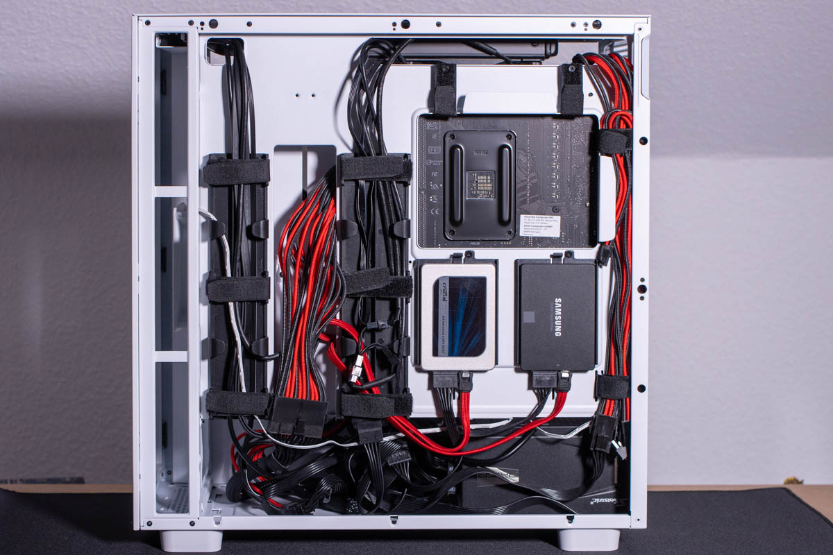 Sehr hilfreich sind die Kabelführungen an der Rückseite des Mainboard-Trays. Hier lassen sich die Kabel sehr gut bündeln und verlegen. Die weitern Klettkabelbinder sind ebenfalls passend positioniert. Ein schönes Detail bei den Gehäusen von NZXT ist auch immer der kombinierte Stecker für die Anschlüsse des Frontpanels, denn so ist eine deutlich angenehmere Montage möglich.