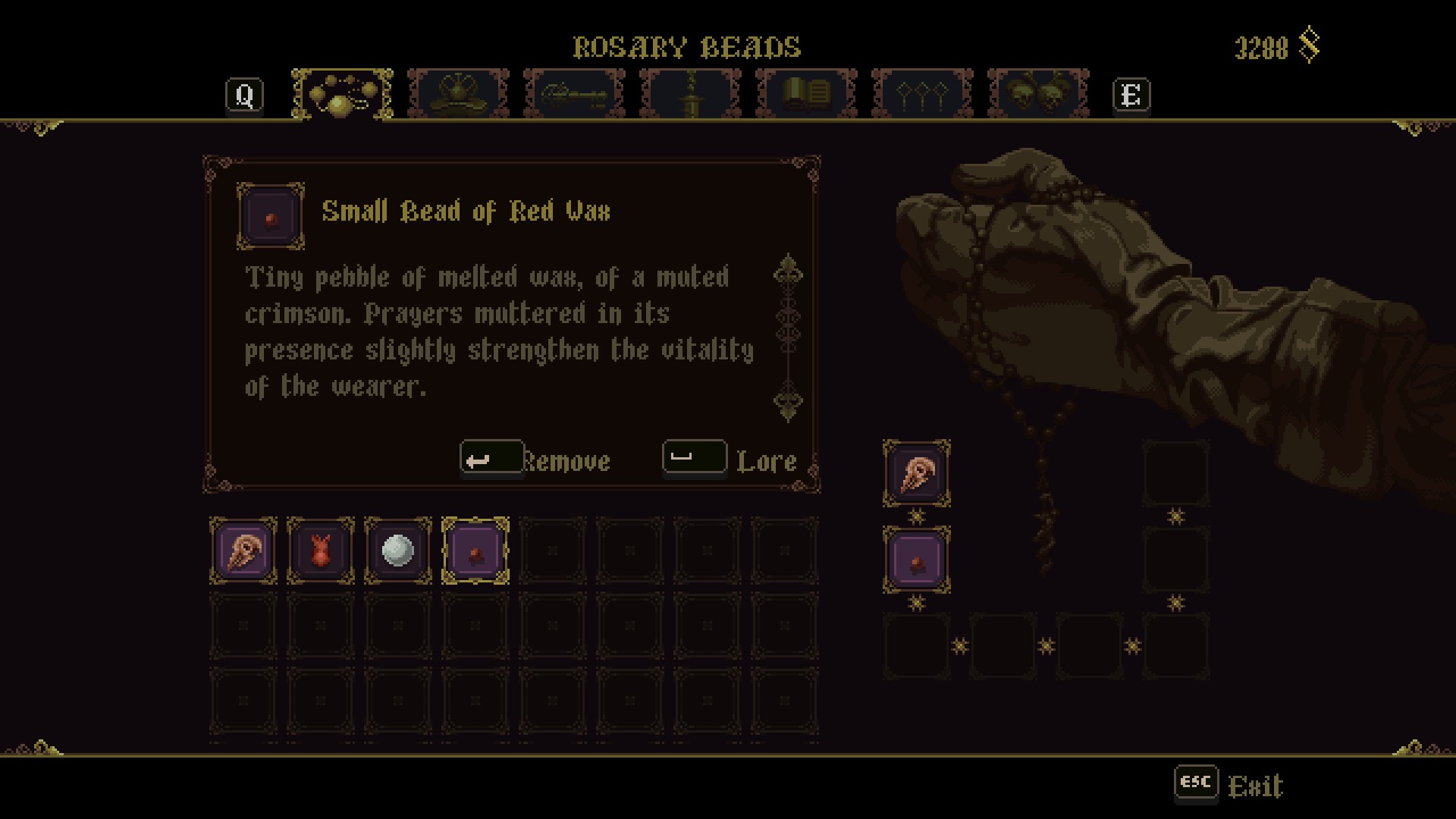 Neben den Gebeten gibt es auch, wie schon angedeutet, Items mit passiven Eigenschaften. Dazu gehören zum einen Perlen für unseren Rosenkranz, die dann zum Beispiel unsere Vitalität erhöhen oder Reliquien. Letztere bieten die Möglichkeit “die Welt mit anderen Augen zu sehen” und eröffnen uns neue Wege in den Levels, Stichwort Backtracking.
